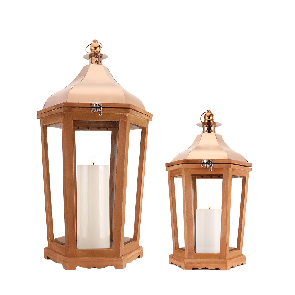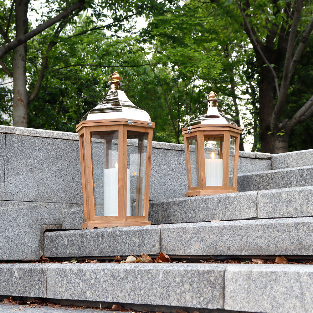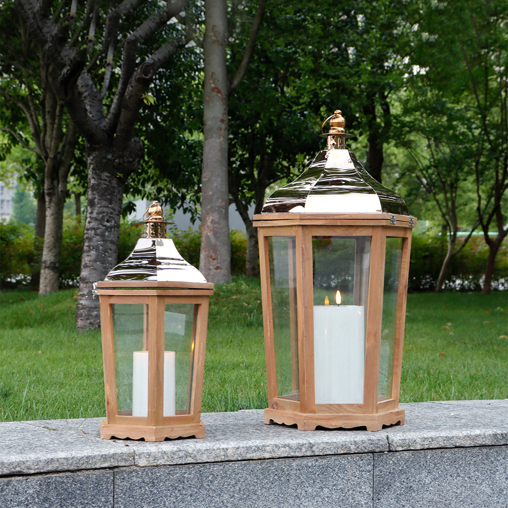Fashioned from authentic wood and metal, these lanterns epitomize durability paired with aesthetics. Their sturdiness, backed by a combined weight that speaks of quality, ensures they remain timeless pieces in any collection.