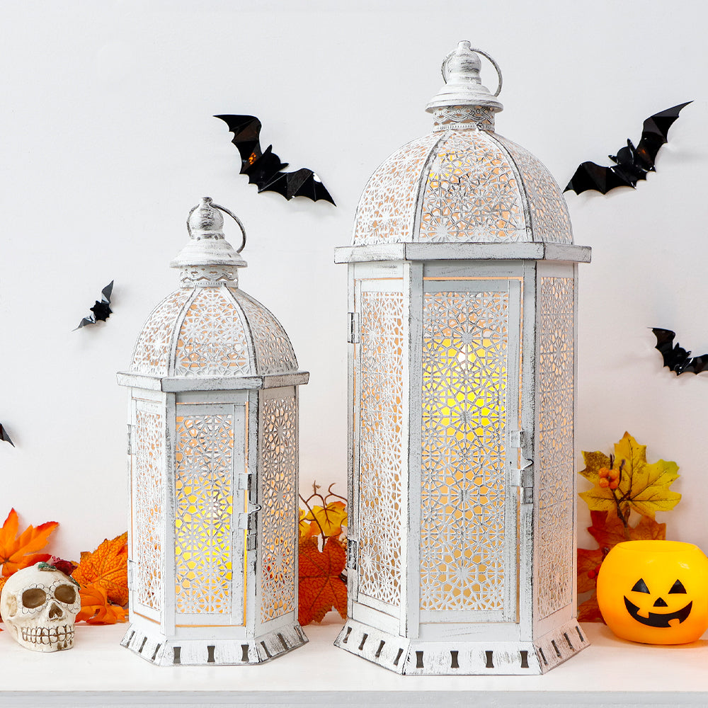 Marrying the old-world charm with modern intricacy, JHY DESIGN presents a set of White Rustic Metal Lanterns, standing proudly at 15"" and 19.5"" in height. These lanterns are not just decorative pieces; they are an experience, a reflection of artistry and style.