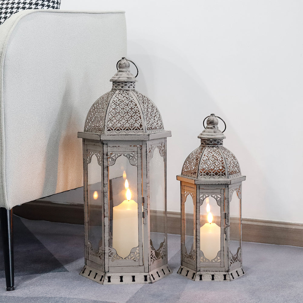 Our 22" and 17" High Outdoor Vintage Metal Led Candle Lanterns symbolize timeless elegance and sophistication. These meticulously crafted outdoor lanterns serve versatile decorative purposes, from enhancing the allure of serene garden parties to adding a romantic flair to outdoor weddings, offering a captivating experience to the observers.