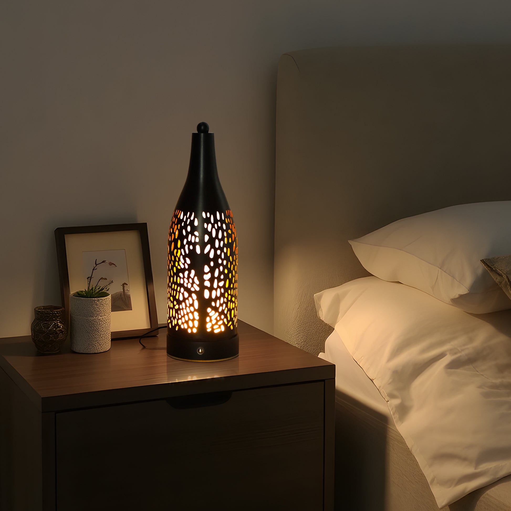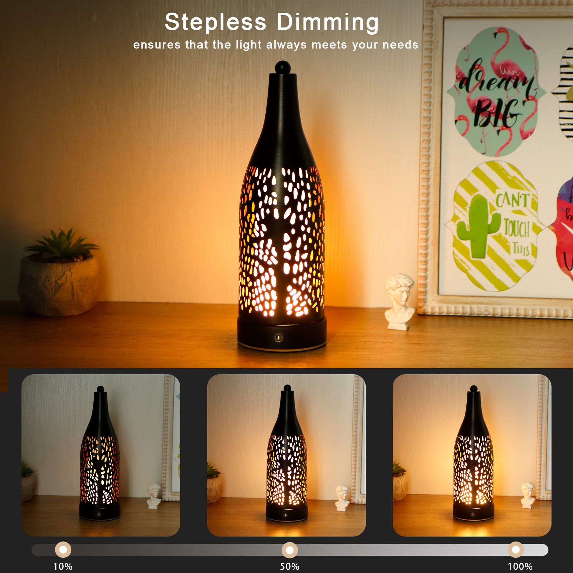PREMIUM PORTABLE LAMP: This wine bottle-shaped, rechargeable lamp is crafted from high-quality metal with intricate cutout patterns that cast mesmerizing shadows. Its elegant design enhances any space, indoor or outdoor, while the sturdy construction ensures lasting durability. A perfect balance of style and functionality for any setting.